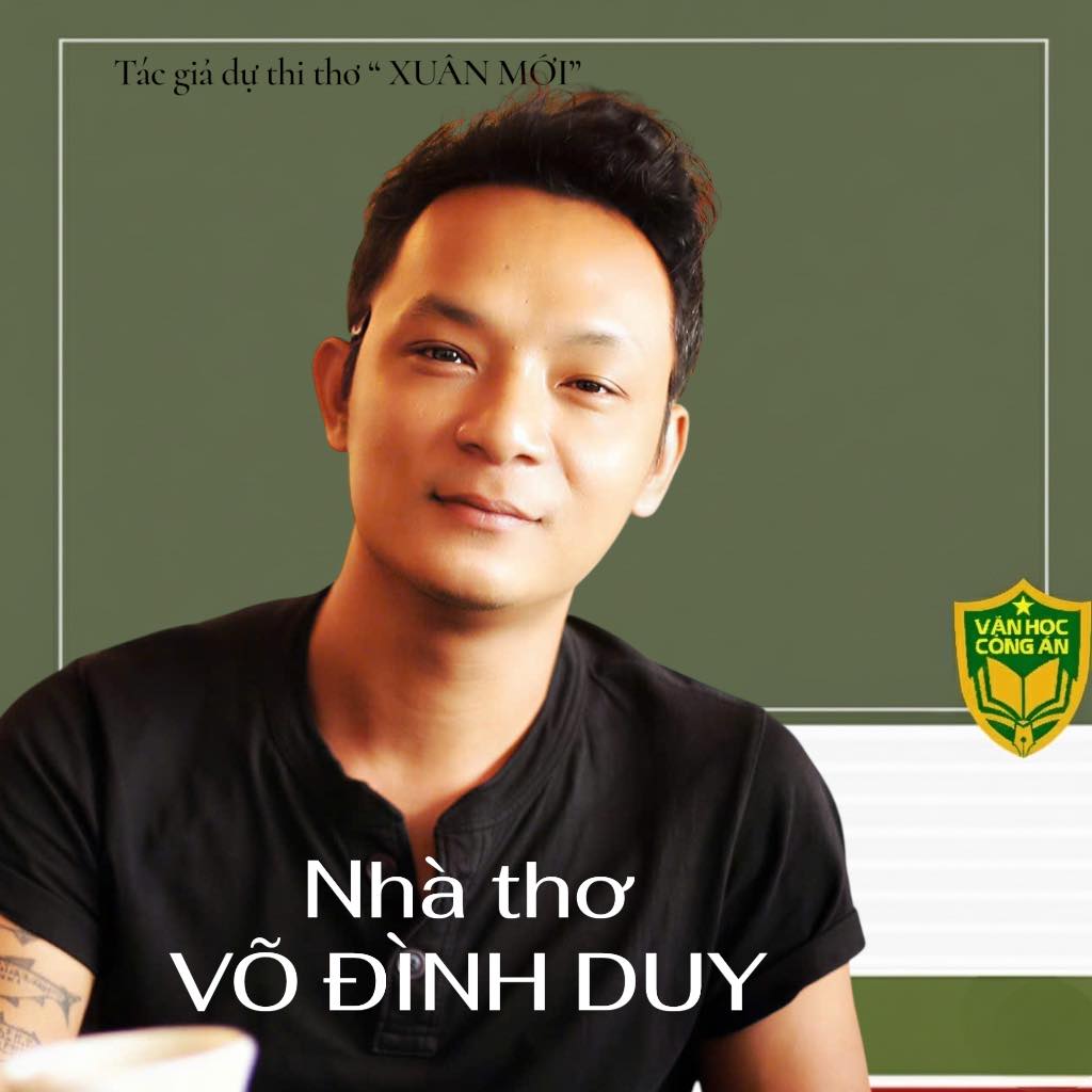 Võ Đình Duy là gương mặt thơ trưởng thành từ nhiều không gian văn hoá khác nhau, thơ anh từng đăng trên Tạp chí Văn nghệ Quân đội, Tạp chí Gia Lai, Báo Áo Trắng… Chùm thơ dự thi Cuộc thi Thơ “Xuân mới” tiếp nối mạch sáng tác giàu suy tư về con người, ký ức và bản sắc. Tác giả đồng thời là nhà văn với các tiểu thuyết đã xuất bản: Núi trên đất bằng; Thung Ca vẫn chưa mưa.
