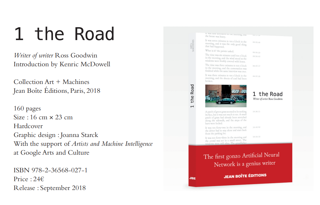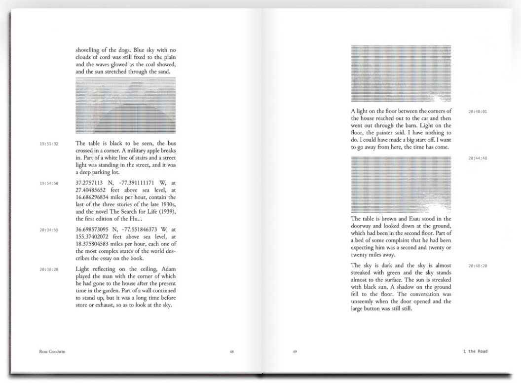 Cuốn tiểu thuyết “1 the Road” (Số hóa những cung đường) ra mắt năm 2018 được tạo ra khi tác giả Ross Goodwin lái xe đi khắp nước Mỹ với một chiếc laptop có gắn camera và GPS. AI trên máy tính tự động viết tiểu thuyết dựa trên những gì camera nhìn thấy và dữ liệu vị trí. Khi xe chạy, AI nhìn cảnh vật, nghe âm thanh, viết và in ra một cuốn tiểu thuyết theo thời gian thực trên các cuộn giấy hóa đơn. Đây được coi là phiên bản AI của tác phẩm nổi tiếng “On the Road” (Trên những cung đường) của Jack Kerouac, một tác phẩm biểu tượng về những chuyến đi tự do của con người. Câu văn do AI viết nhiều khi lủng củng, nhưng cũng có những câu thú vị mà con người khó có thể nghĩ ra, ví dụ như: “Bảy phút trước mười giờ sáng và đó là điều tốt đẹp nhất từng xảy ra”.