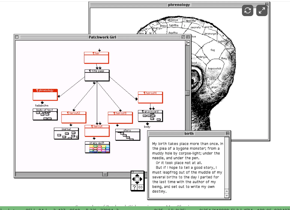 Tác phẩm “Patchwork Girl” (Cô gái chắp vá) của Shelley Jackson (1995) thuộc loại hình văn bản siêu liên kết và đa phương tiện (hypertext & multimedia). Loại hình này minh chứng cho việc đọc không còn tuyến tính, đi từ trang đầu đến trang cuối mà là một mê cung do người đọc tự chọn lối đi. Định dạng tác phẩm là CD-ROM (thời kỳ đầu) và sau này là phần mềm giả lập. Đây là một phiên bản viết lại của tác phẩm nổi tiếng “Frankenstein” của Mary Shelley. Thay vì một con quái vật nam, đây là một quái vật nữ được ghép từ các bộ phận cơ thể của phụ nữ. Màn hình hiển thị hình ảnh một cơ thể phụ nữ bị khâu vá. Độc giả muốn đọc chuyện về “cái chân”, phải click chuột vào cái chân; muốn đọc về “bộ não”, phải click vào đầu. Văn bản bị xé lẻ như cơ thể người máy, người đọc phải tự khâu câu chuyện lại bằng các cú click chuột.