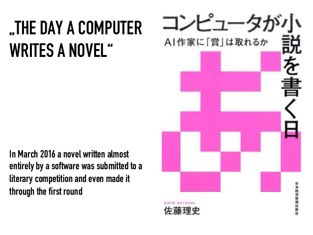 Tác phẩm “The Day A Computer Writes A Novel” (Ngày máy tính viết tiểu thuyết) của nhóm nghiên cứu đại học Future Hakodate tại Nhật (2016) đã lọt qua vòng sơ khảo của giải thưởng văn học Hoshi Shinichi tại Nhật Bản và giám khảo không biết nó do AI viết. Nhóm nghiên cứu tạo ra cốt truyện và nhân vật, AI lựa chọn từ ngữ và viết thành câu hoàn chỉnh. Câu kết của tác phẩm rất ám ảnh: “Ngày máy tính viết xong tiểu thuyết, nó ngừng phục vụ con người và bắt đầu tìm kiếm niềm vui cho riêng mình.”